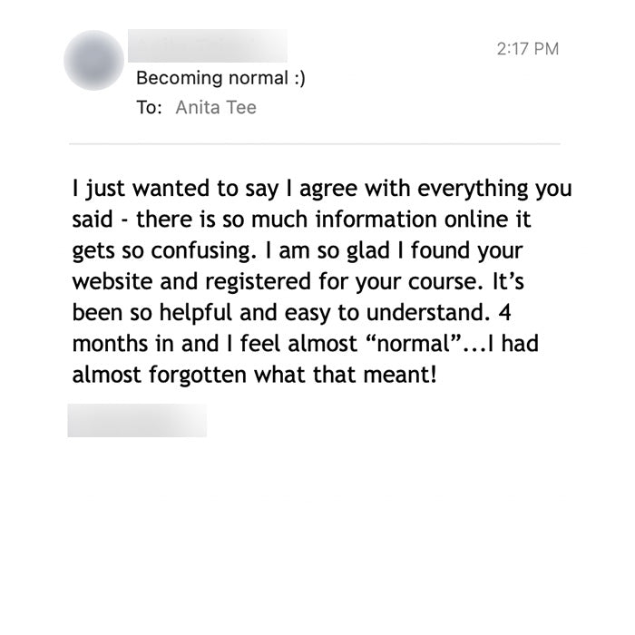 l just wanted to email a big thank you!!! After watching your histamine webinar I'm only on stage 2 and already I can say that my symptoms are virtually gone. I've tried everything under the sun and this is the only thing that's helped. I've started reintroducing foods slowly and have a few of my favourites back already. It's only been 2 months so I'm excited to see what more time and the remaining stages of the webinar will bring :)