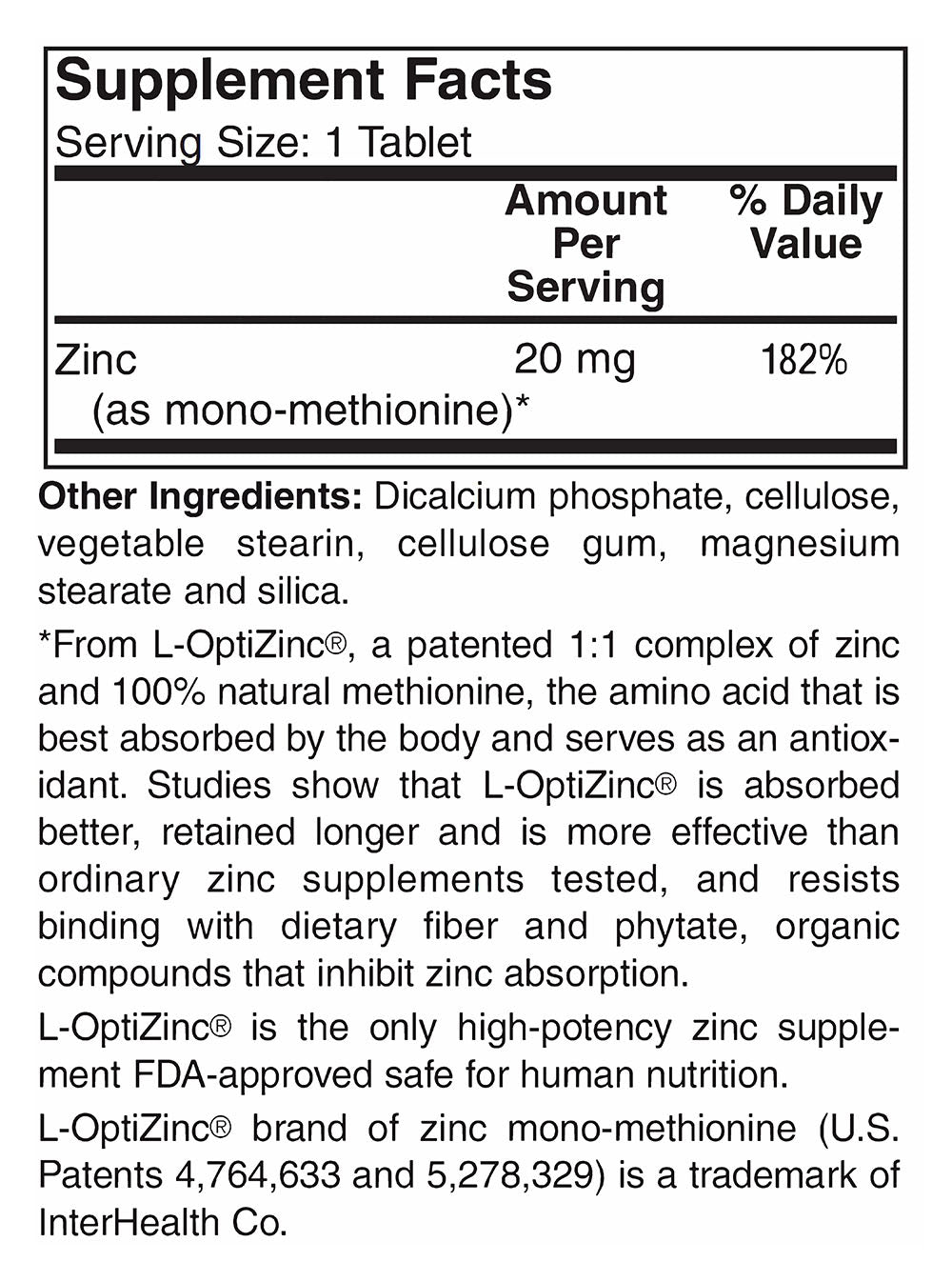 This supplement is formulated using OptiZinc, a patented 1:1 complex of zinc and 100% natural methionine. Studies show OptiZinc is absorbed better, retained longer and is more effective than ordinary zinc supplements.