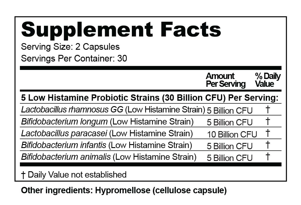 This probiotic was created for those who are histamine intolerant, as it only contains low histamine or histamine-neutral bacterial strains and subtypes. Most probiotics contain histamine-producing bacteria, which is tolerable to most individuals but can provoke histamine symptoms in intolerant individuals.